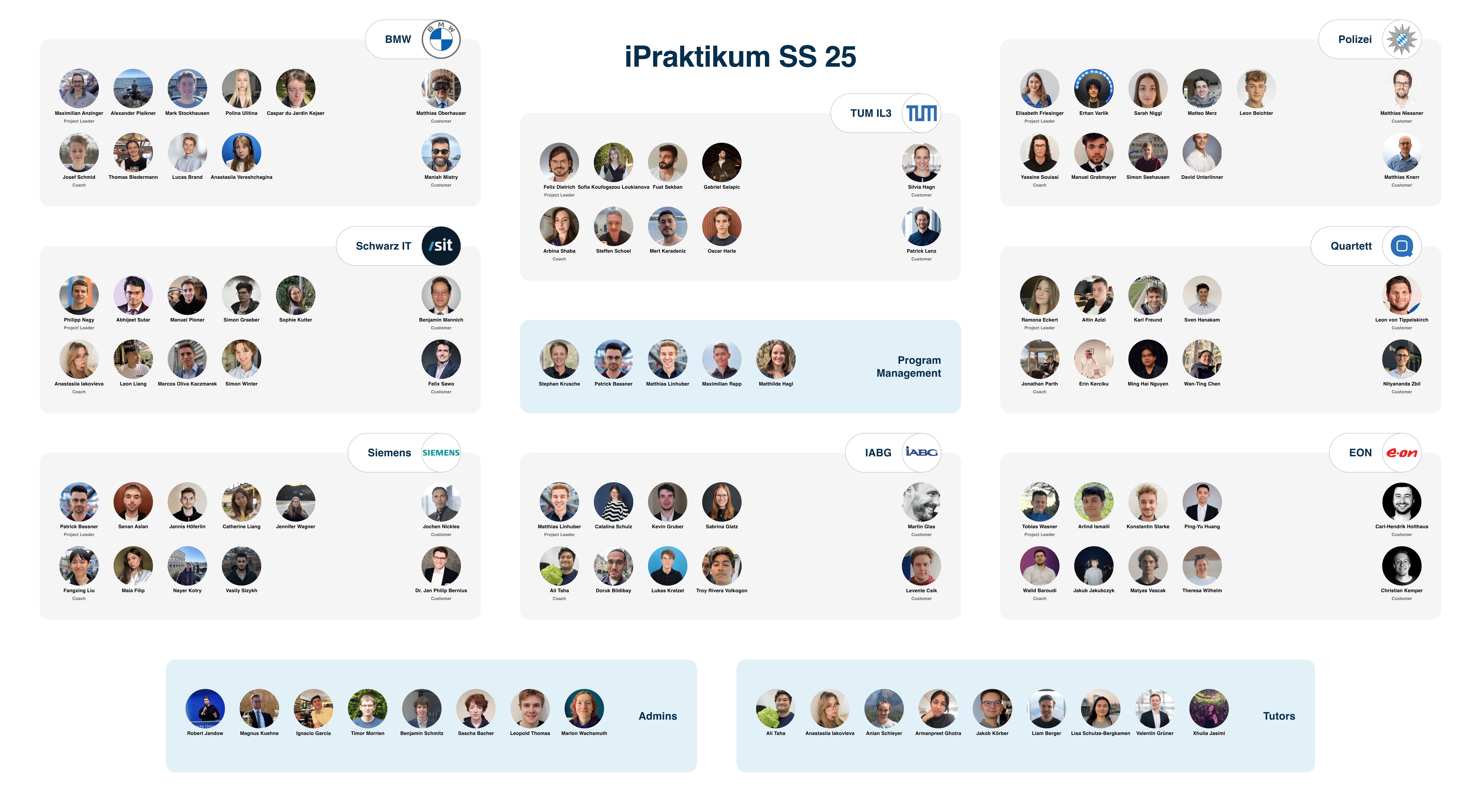 The chart shows the project-based organization of the course. All projects are shown as columns, including information about the customer, project management, and student team. A team of twelve student coaches dealt with the project management of the teams.